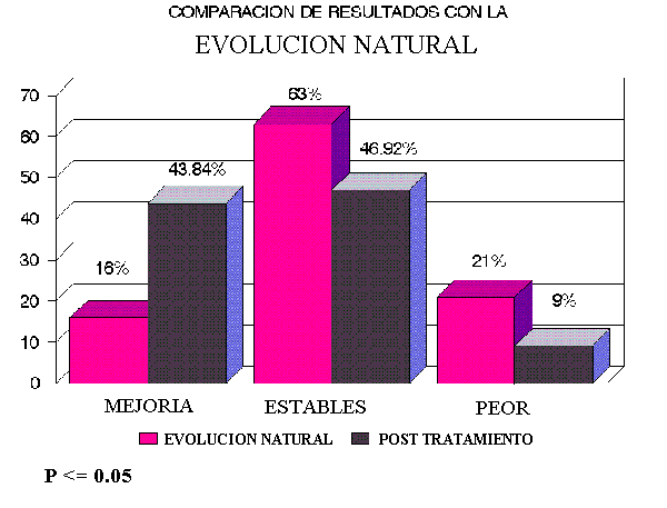 Del análisis comparativo de 130 perimetrías resultó que un 43.84% de las mismas mostraron mejoría al compararse evolutivamente después de realizada la cirugía, un 46.92% permanecieron estables y un 9.3% empeoraron. En comparación con la evolución natural esperada se observó una diferencia del 27.84% al compararse la mejoría expontánea de la que sigue al tratamiento quirúrgico. Cuando se comparó el grupo que se mantuvo estable vemos que la diferencia creada con la evolución natural favoreció a esta última en un 16.08%. Lo anterior se debe a que de este grupo pasaron hacia el grupo de mejoría un cierto número de ojos. Algo parecido sucedió al analizar el empeoramiento, en el que de un 21% que empeoraban como parte de su evolución natural se encontró, que después de la cirugía sólo un 9.23% empeoró. Predominaron, entre aquellos pacientes que empeoraron, aquellos en estadíos evolutivos más avanzados. Las diferencias encontradas fueron estadísticamente significativas (p<= 0.05).