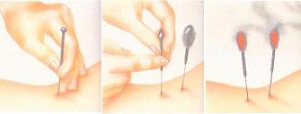 arriba) o aplica moxa (derecha, centro), hierba que produce calor